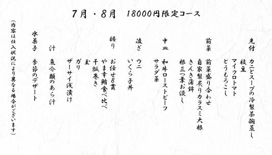 今回のプロジェクトでは、季節ごとに趣向を凝らした特別コースをご用意しました。夏には「冷製茶碗蒸し」や「幸水梨ブランデー浸し」など涼を感じる一品を、秋には「松茸」や「柿釜白和え」など実りの季節を彩る逸品をお楽しみいただけます。どのコースでも「やま幸」から直接仕入れる極上マグロの食べ比べは外せない一品なので特別に全コースにお付けします。