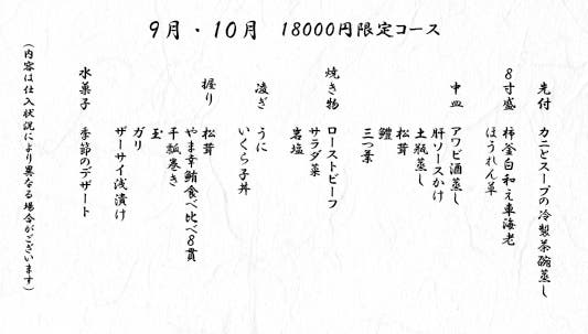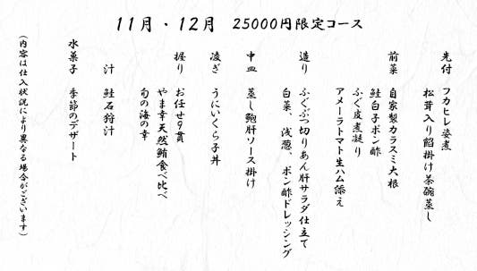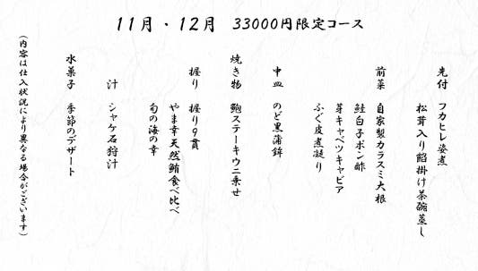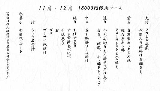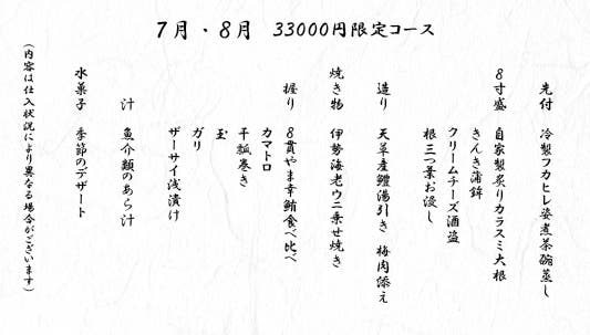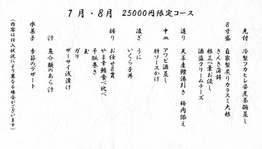 ※仕入れ状況によってお出しするメニューが変わりますが、より良いものを提供できるよう努めさせていただきます。