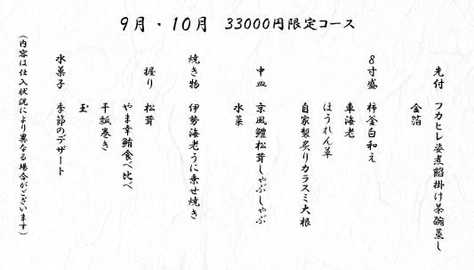 「伊勢海老ウニ乗せ焼き」や「京風鱧松茸しゃぶしゃぶ」など、季節の最高級食材を贅沢に使用。締めくくりには「マスクメロン」をご用意し、最後まで満足感あふれる美食体験を。