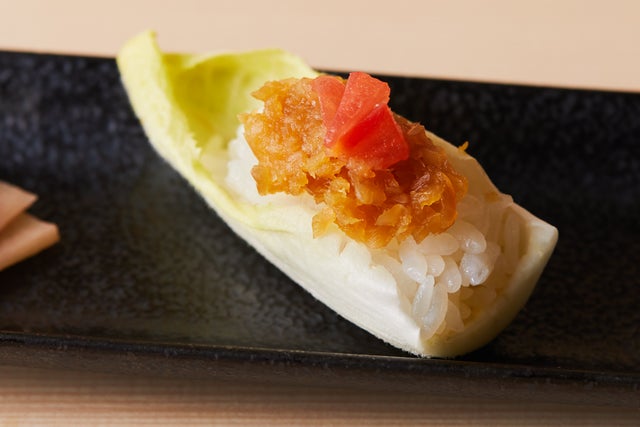 そして後半に登場する3貫は、大トロ、中トロ、漬け赤身で、これらは昔ながらの赤酢を使い、キリリと塩味のきいたシャリでお楽しみいただきます。