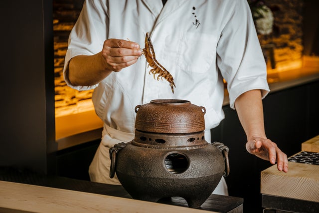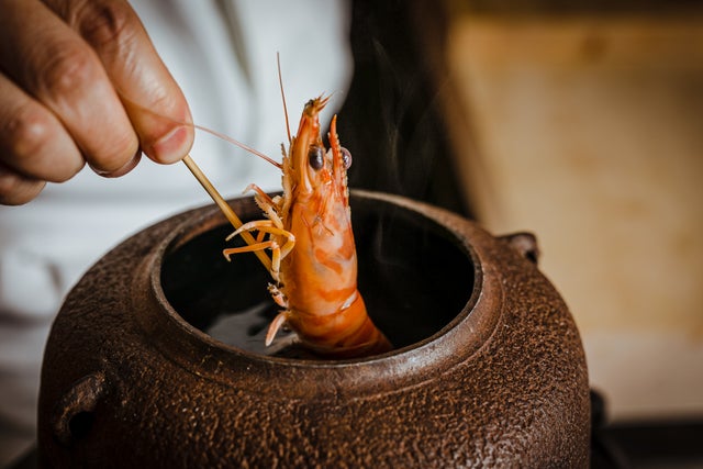 また、生きたまま串に刺したえびを、骨董の茶釜に入れて湯通しする「酔わせえび」も、絶好のシャッターチャンス。
