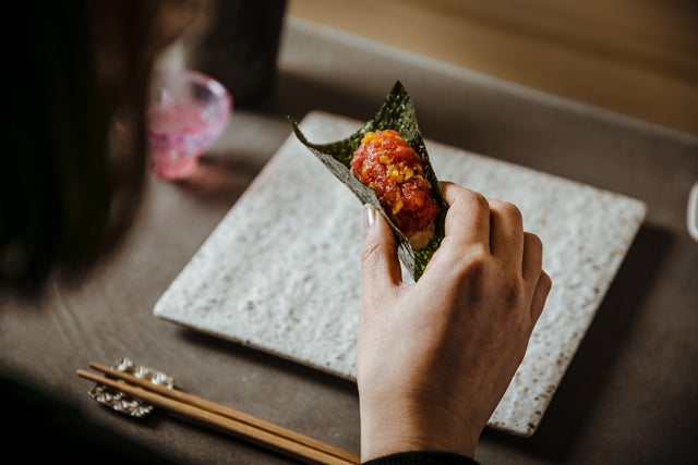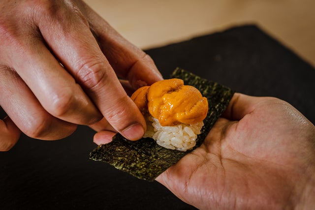 たとえば手巻きでは、お客様にのりを手にしていただき、その上に大将がシャリとうにをのせ、お客様にくるりと巻いていただくスタイルを採用しています。