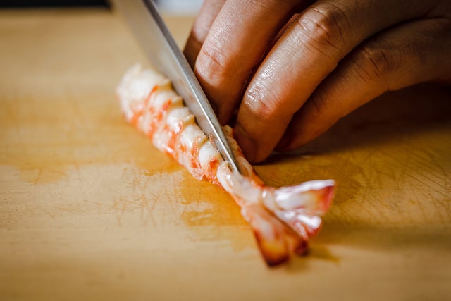 まさか、鮨屋に茶釜があり、それで生きたえびを湯通しするとは、誰も想像つかないでしょう。茶釜から引き上げられた真っ赤に色づいた海老を見て、感嘆の声をあげるお客様も。火の通り加減も絶妙で、しっとり柔らかな食感です。