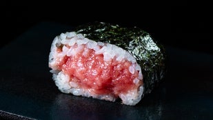 中トロ・赤身・漬け中トロ・漬け赤身の4貫と巻物1本で贅沢に振る舞う。