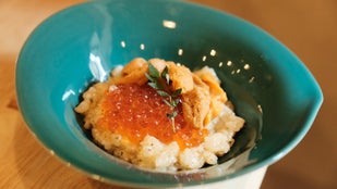一度は味わいたい『寿司 周辰 SUSHI SHUTATSU』のスペシャリテは、「ウニとイクラ、鮑肝ソースの贅沢リゾット」濃厚な鮑肝ソースをたっぷりまとわせたリゾットに、ウニとイクラを惜しみなく乗せた、まさに至高の一品です。
