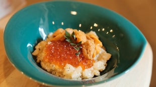 ・当店のスペシャリテ「ウニとイクラ、鮑肝ソースの贅沢リゾット」