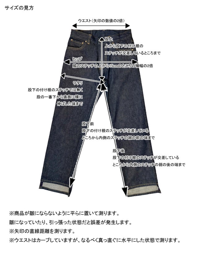 ※目安は大体のものです。実寸の数値とお手持ちのパンツを比較してご検討下さい。