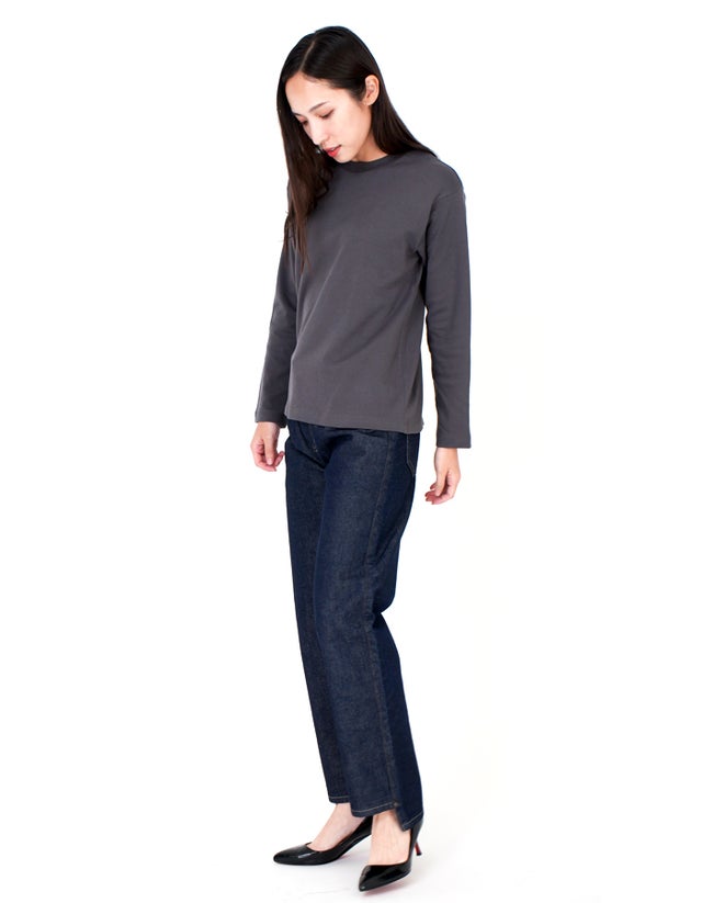裾のカットが独特で、前が短く後が長くなっています。前後差は5cmです。