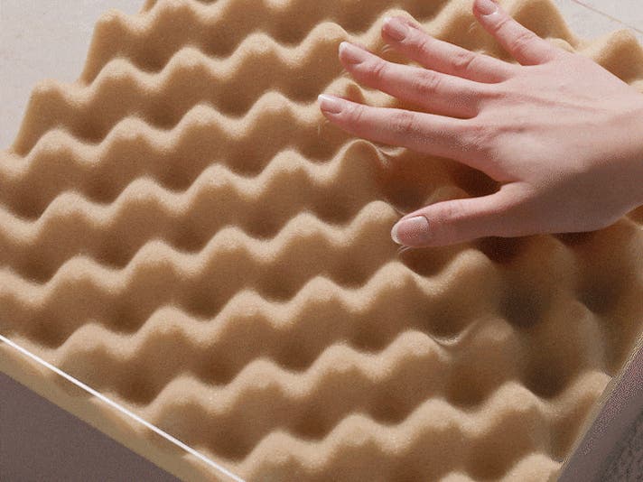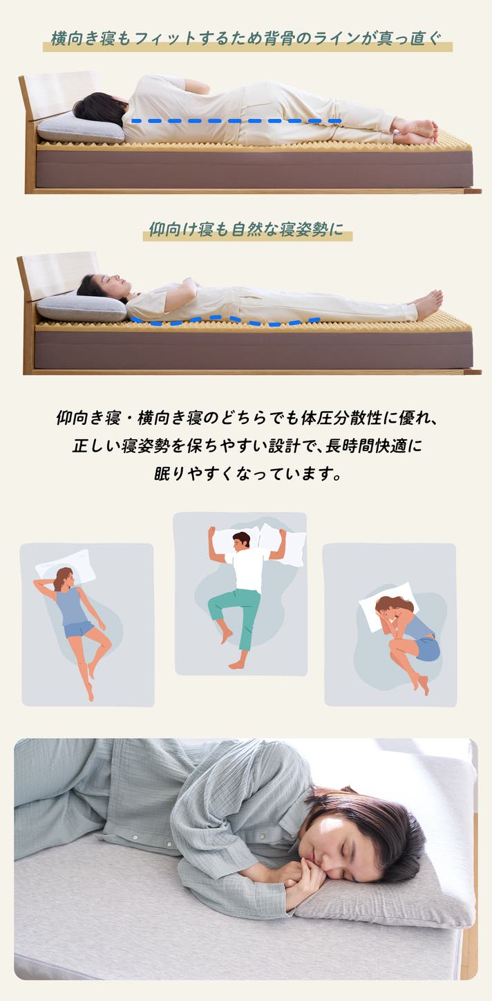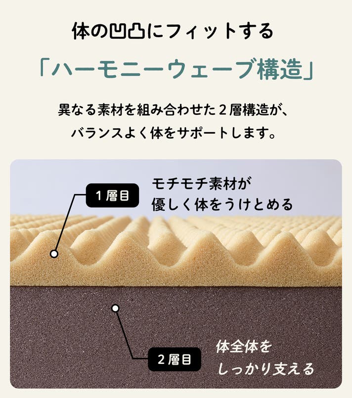 長年の睡眠研究と特許技術をもとに、素材・加工・形状にこだわり、寝心地と体圧分散性の両立を目指した2層構造になっています。