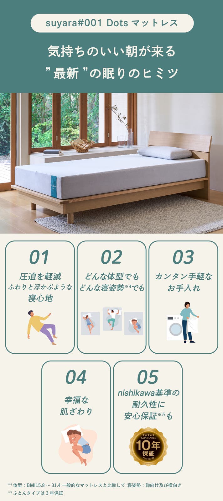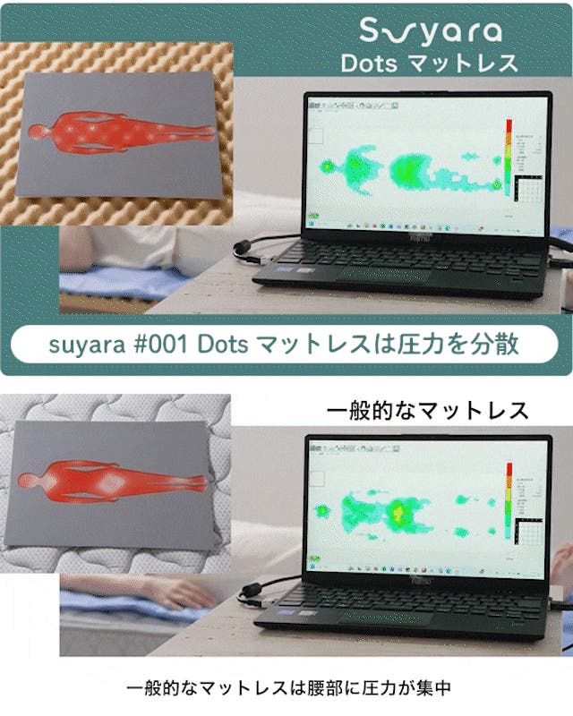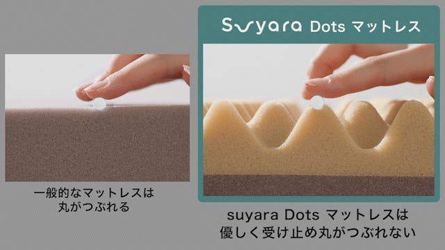 suyara Dots マットレスは『ふわりと浮かぶような寝心地』を目指し、徹底的に全身の負荷を軽減するよう考えました。