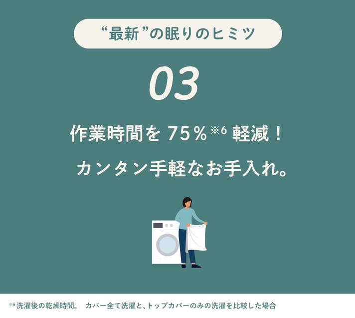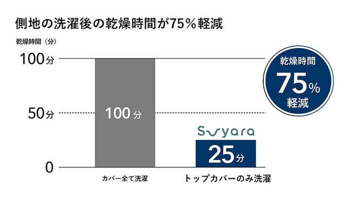 カバー全てをお洗濯した場合と比べて、75%も乾燥時間が軽減できます。また、インナーカバー付きで衛生面も考慮した仕組みになっています。