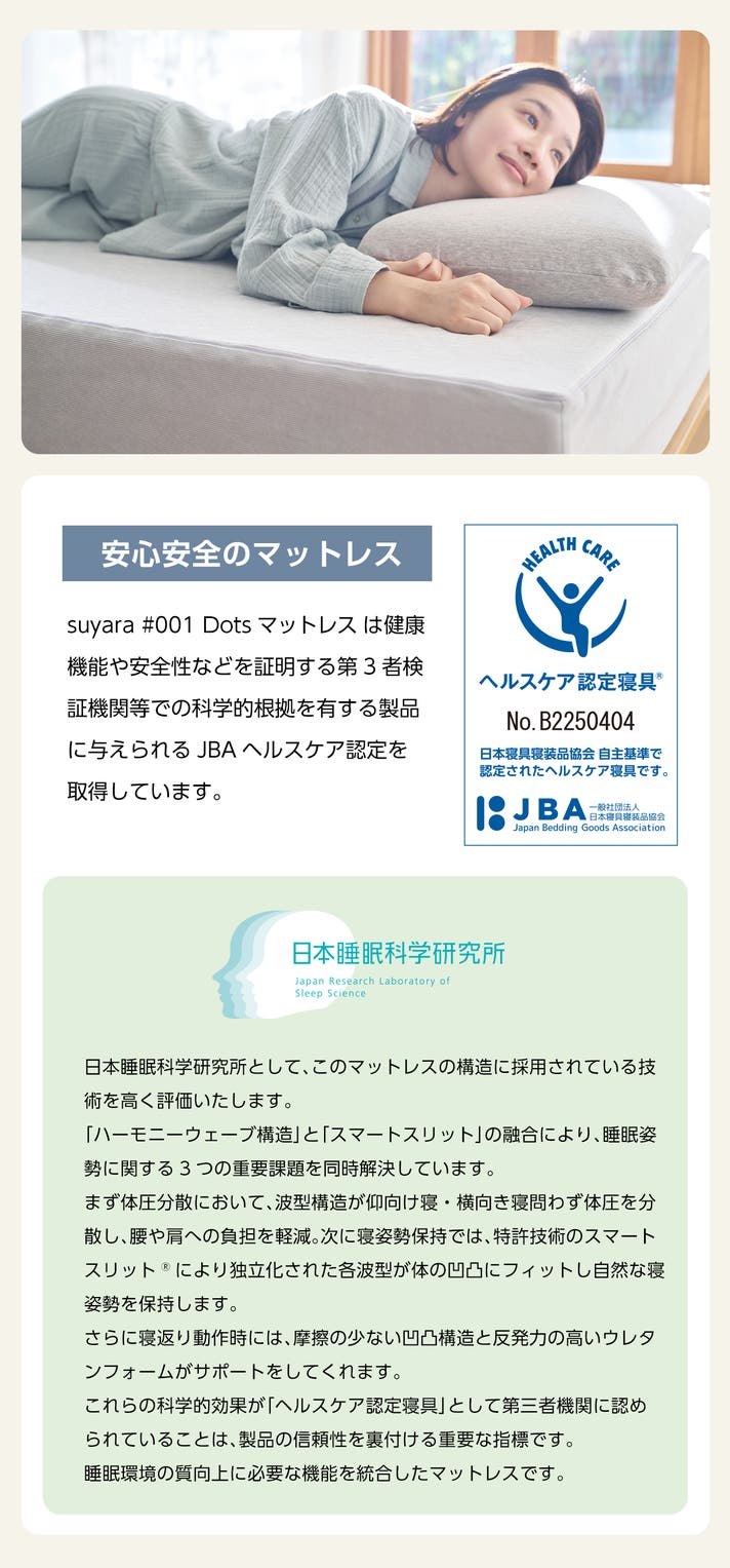 suyara(スヤラ)のマットレス Dots(ドッツ)は「体圧分散性」「腰への負担軽減」「寝返り性」「横向き寝が楽」などの機能性が日本寝具寝装品協会に認められ、ヘルスケア認定を取得しました。