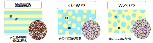 乳化の種類で一般的なのは 、球状の油が水の中に分散しているタイプ(O/W型)と球状の水が油の中に分散しているタイプ(W/O型)です。