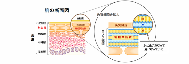 その主な成分であるセラミドが、水と脂とを仲よくさせる機能が備わっていて、角質層の構造を保っています。