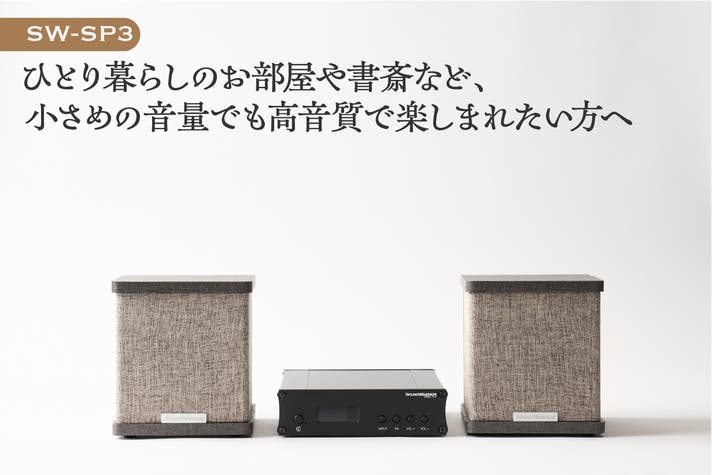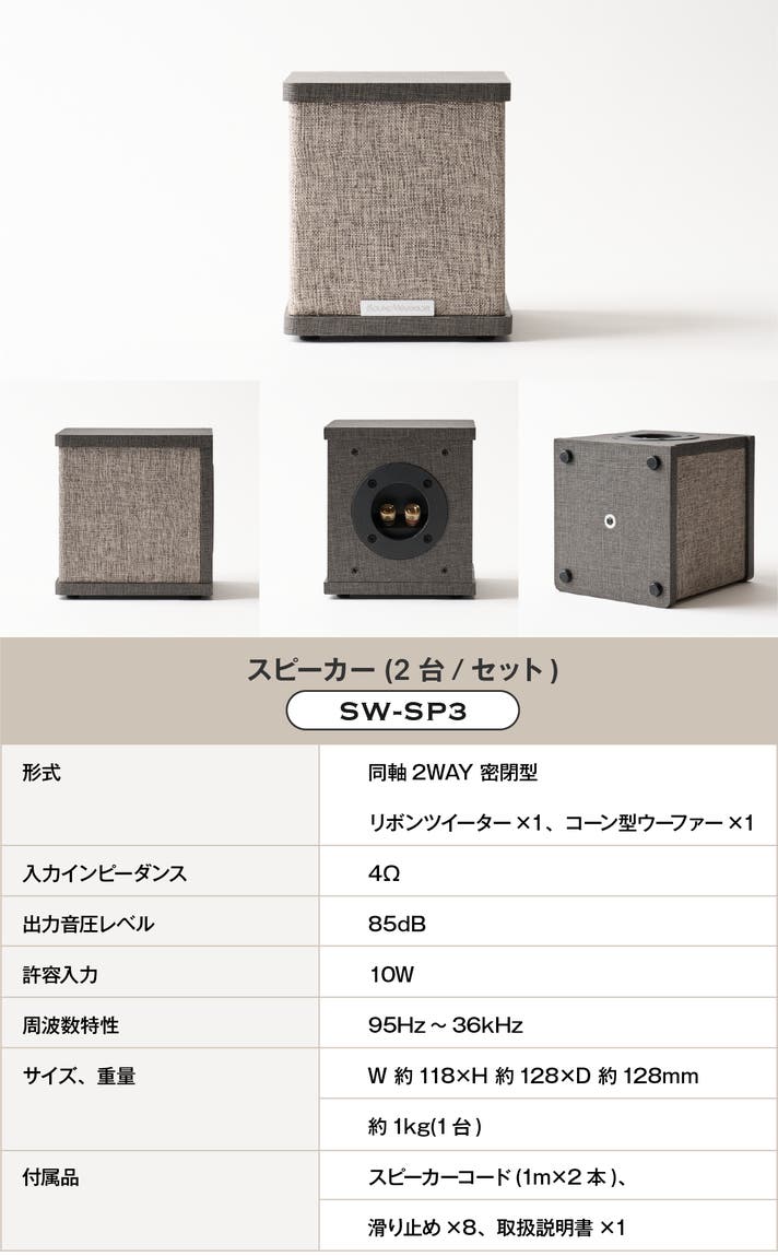 デスクトップオーディオに適したサイズとデザインを追求したサテライトスピーカー「SW-SP3」は、約13cmのボックスの中にリボンツイーターと3インチのコーン型ウーファーを配置。超広帯域:100Hz~36kHzまでの再生を目指したスピーカーです。