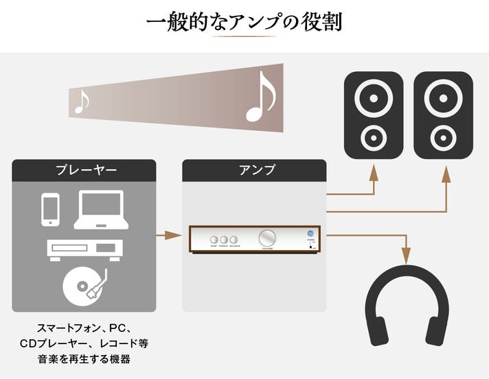 一言で言うと、アンプは「プレーヤーからの小さな音の信号を、スピーカーを鳴らせるくらい大きくする装置」です。
