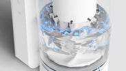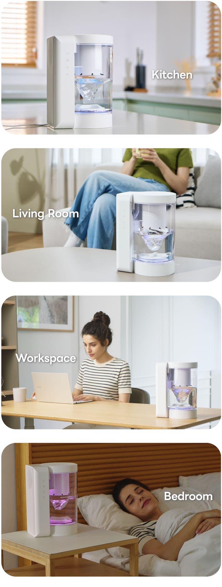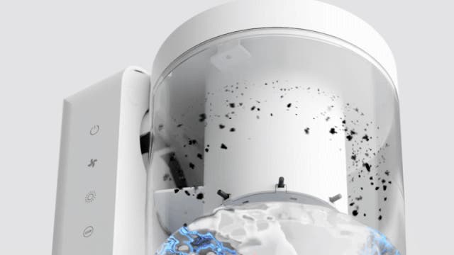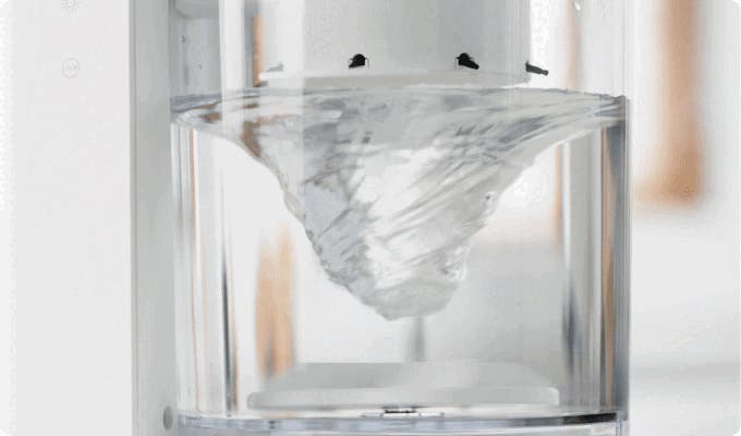 自然現象に着想を得た循環の力で、空気中の微細な粒子を水へと導く仕組みを採用しています。カーボンファイバー電極が空気の流れに働きかけ、渦状の循環によって取り込まれた粒子が水とともに循環することで、室内をより心地よい空間へと整えるサポートを行います。