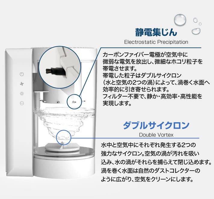 カーボンファイバー電極が空気中に微弱な電気を放出し、微細なホコリ粒子を帯電させます。帯電した粒子はダブルボルテックス(水と空気の2つの渦)によって、渦巻く水面へ効率的に引き寄せられます。フィルター不要で、静か・高効率・高性能を実現します。