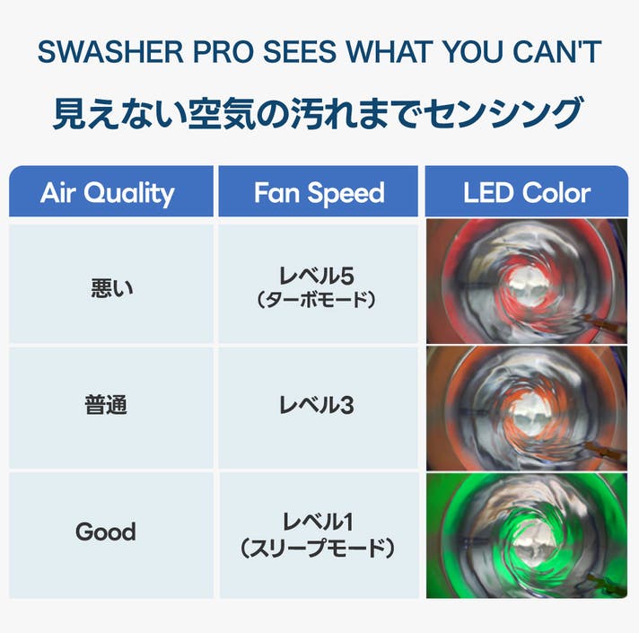SWASHER PROは、あなたの目では見えない空気の汚れまでオートモードでは空気質を常にモニタリングし、最適な浄化が行われるよう自動で風量を調整します。