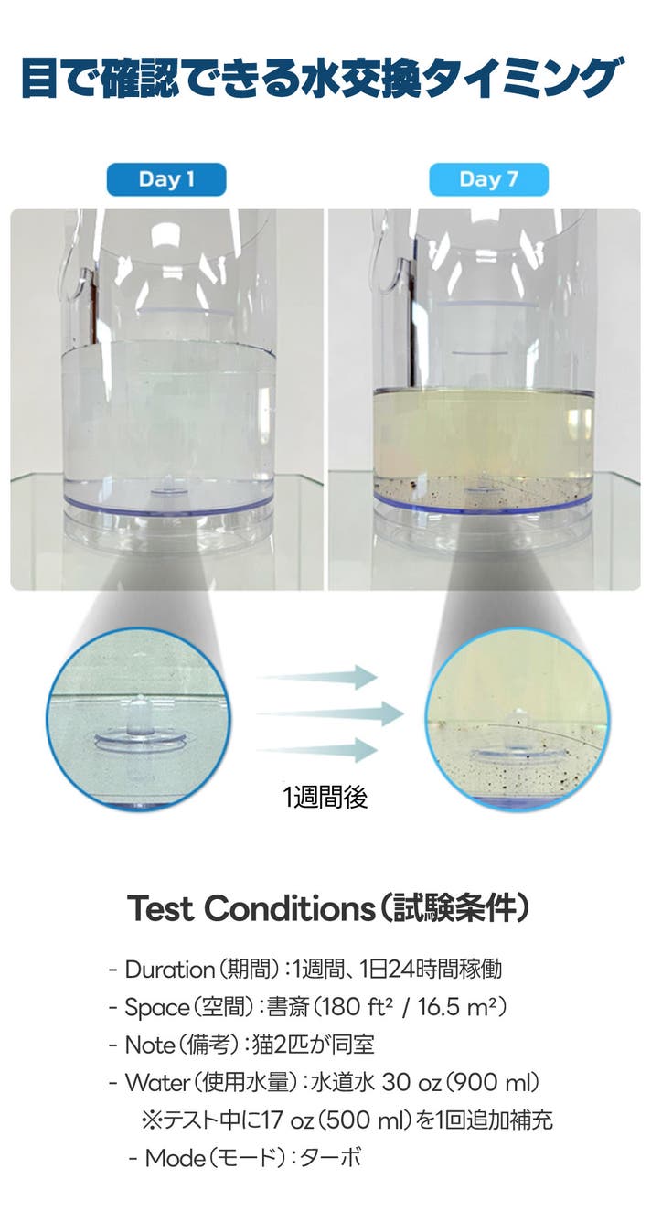※本テストは、1週間・24時間連続稼働、猫2匹がいる16.5㎡の室内環境で実施しました。使用水は900ml+追加500mlのみで、ターボ運転でも安定した性能を確認しています。