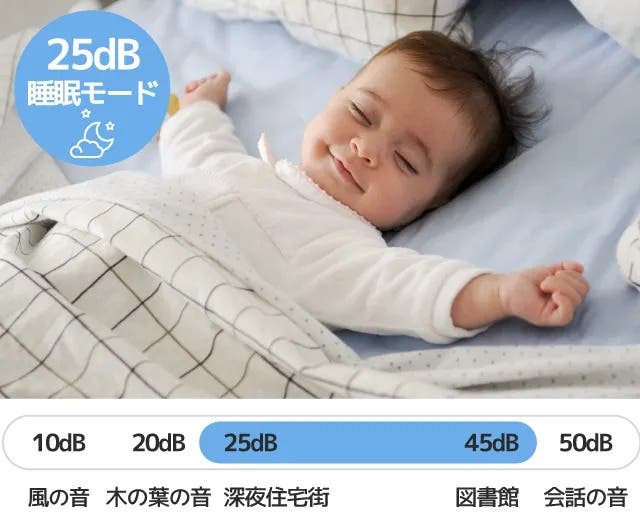 製品のファン音は、スリープモードでわずか25dB。 睡眠を妨げないほどの静音で運転します。強力運転となるレベル5(48〜52dB)でも、日常会話(約55〜60dB)より静かで、 静かなオフィス環境に近い騒音レベルに抑えられています。