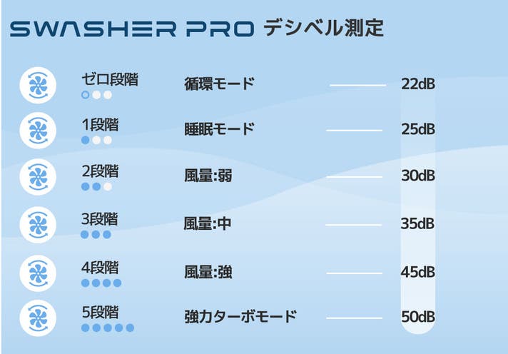SWASHER PROは、3段(定格風量)で約5時間運転した場合、約12〜13㎥程度の空間(約5㎡)をケアできます。換気がしにくいキッチン、寝室、リビングなどに最適です。※本テストは、容量3.0㎥のチャンバー内で、温度23±5℃・湿度55±15%RHの環境下、作動モード「3段(定格風量)」で72分間運転した際に得られた試験結果です。