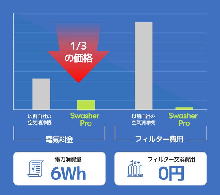 SWASHER PROは、 フィルター交換も不要なため、経済的で環境にもやさしい仕様です。SWASHER PROは、静かでクリーンな空気清浄をいつでも安定して提供できる次世代型のエアウォッシャーです。