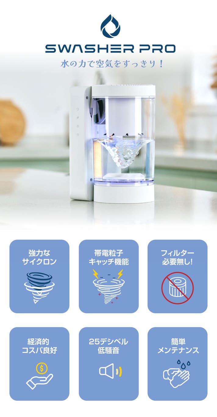その想いから生まれたのが Swasher pro。複雑なフィルターに頼らず、水の渦流だけで空気をきれいにする 新発想のエアウォッシャーです。