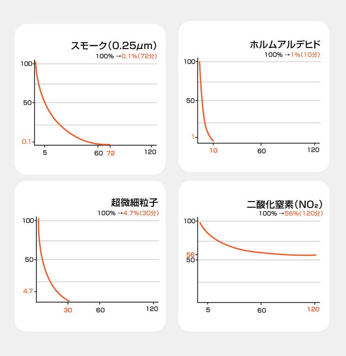 ※本試験結果は、規定された試験環境下におけるデータであり、実際の使用環境における性能を保証するものではありません。使用状況、設置環境、温湿度などの条件により効果は異なる場合があります。