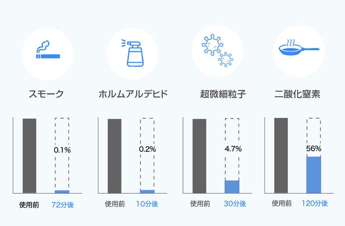 ※2 ホルムアルデヒド:ホルムアルデヒド除去試験は、チャンバー内に機器を設置し、水5Lを注入した後、1分間の予熱を行い密閉して実施しました。