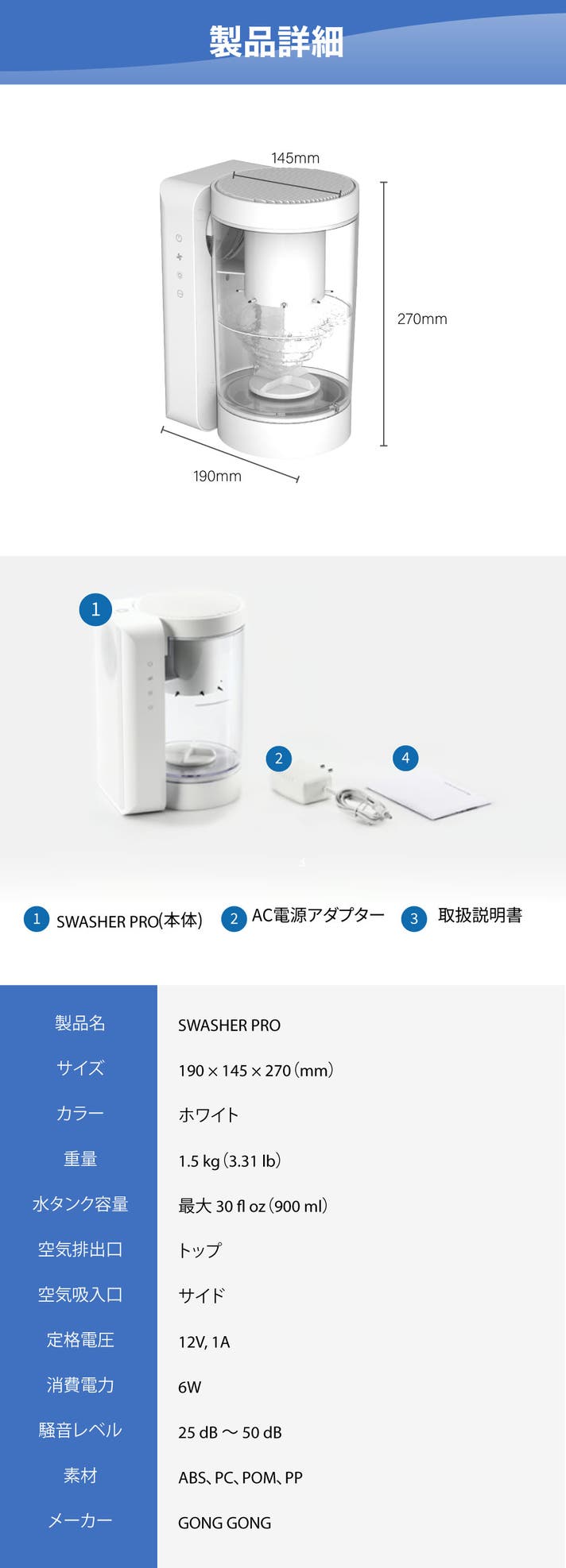 SWASHER PROは900mlの水道水だけで動作するため、 コストが安く、日々の管理もとても簡単です。ウォータータンクは流水でサッとすすいで拭くだけ。特別な洗剤や専用ツールも必要ありません。分解して洗える構造で衛生的に使え、すすいだ後は水道水を入れてスイッチを押すだけ。誰でも手軽にお手入れができるのが大きな魅力です。