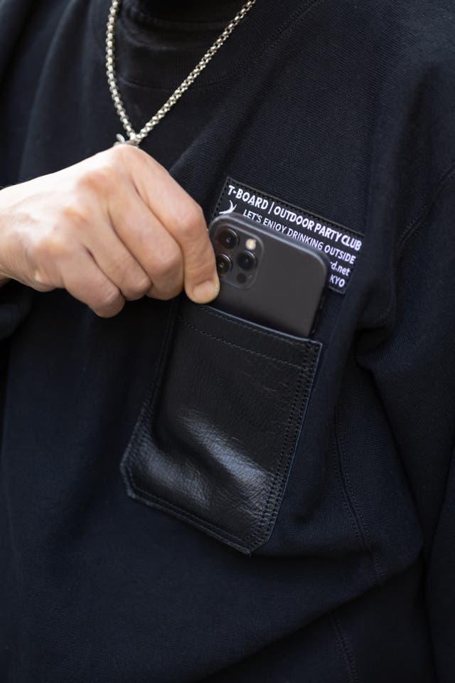 - このスウェット愛用のバッグデザイナーが職人にスマホ用革ポケットを縫わせた事から始まりました。