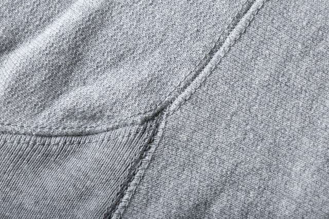 空気の旋回流によって紡がれ、中心から表面に向かって整然と旋回する美しい撚りの構造を持つ "糸" を使って織られた厚地スウエット生地を採用しています。