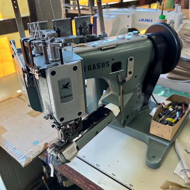 *三本針の縫製。脇と身頃の縫製は強度を増すため3本ステッチで縫製します