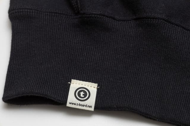スウェットシャツ完成後に洗いをかけて、革ポケット、ワッペン、T-BOARDネームを縫製しています。