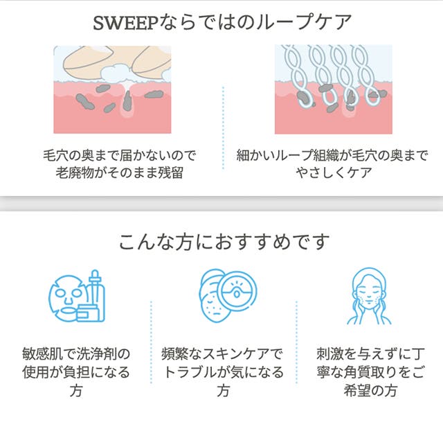 複雑で面倒な過程を経ず、日常で毎日繰り返されるシャワーと洗顔だけで本来の自然な肌状態を作るために誕生しました。 いつものように石鹸を塗った後、いつものように軽く洗顔するように、SWEEPのきめ細かいループが肌表面の角質はもちろん、毛穴の中の老廃物まできれいに洗い流して、さわやかでなめらかな肌に仕上げます。