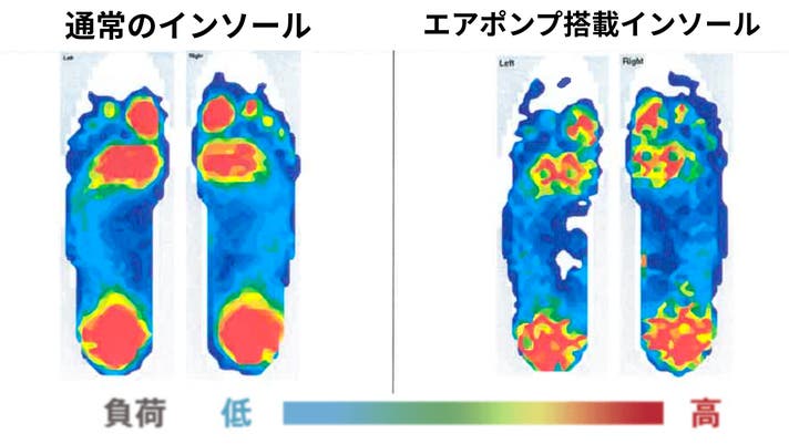 特定の箇所に集中しがちな圧力が、エアポンプシステムを使うことで、足裏全体でやさしく受け止められているのがお分かりいただけるでしょう。
