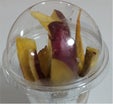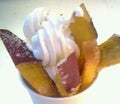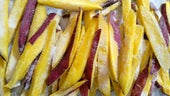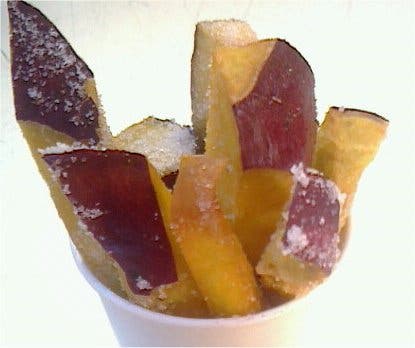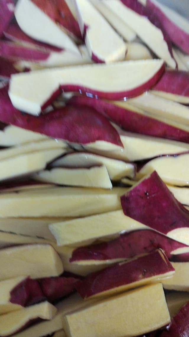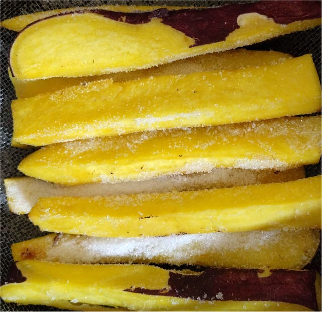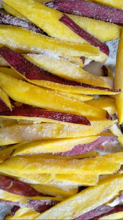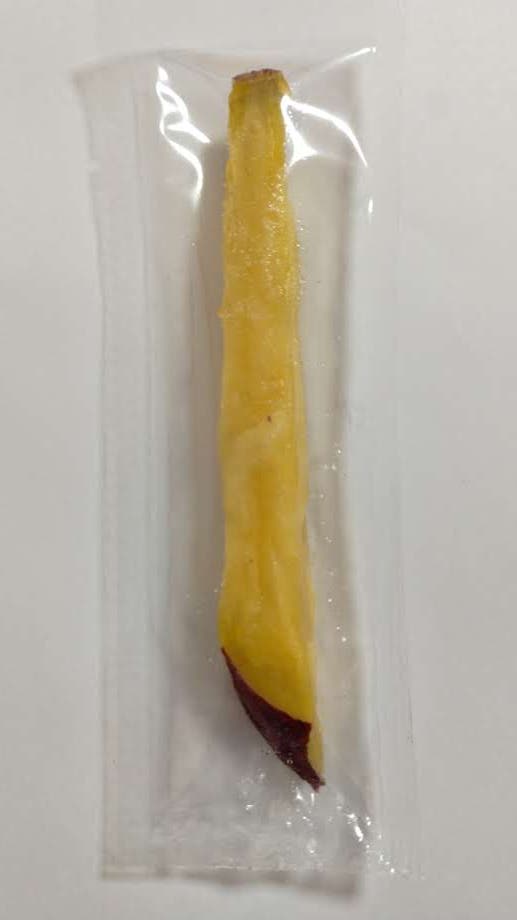 さつまいものでんぷんは低い温度で加熱すると黄色く変化していきます。これはでんぷんが糖化していく事なのですが、揚げる場合は低い温度ですとべちょべちょになってふにゃふにゃな食感になってしまいます。下処理と揚げ方の工夫によりしっかりしたさつまいもスティックが完成しました。