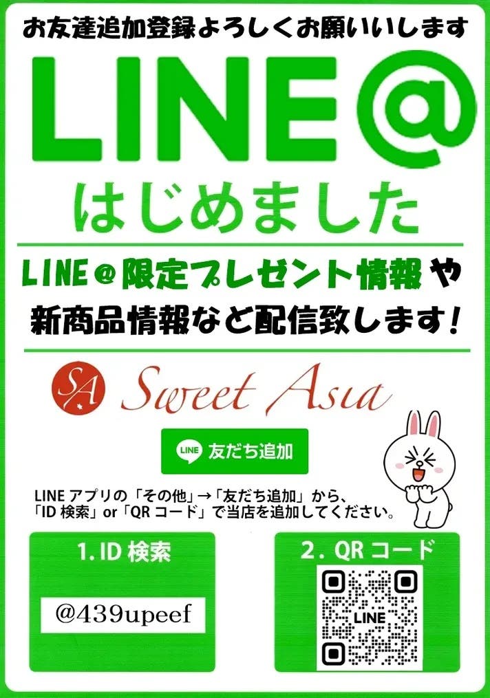 限定プレゼントのご案内や新商品情報等を配信しております。是非LINE@お友登録をよろしくお願いいたします!