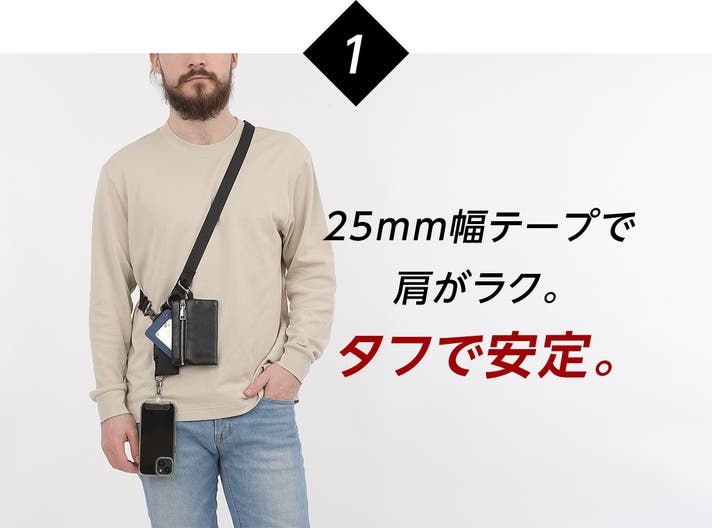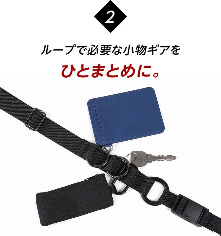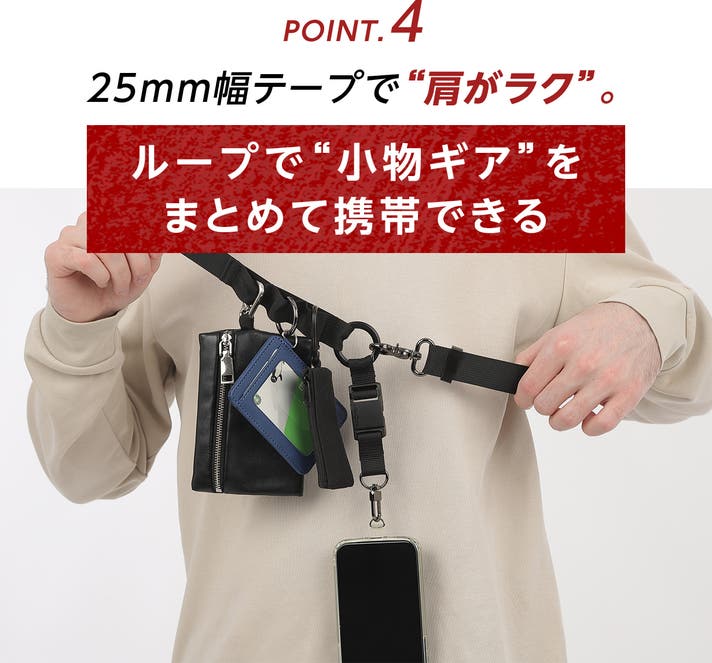 - 3つのループで必要な小物をまとめて持てる、両手が使えるので世界が広がる解放感。