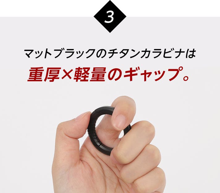 装備にこだわる大人ほど、パーツの質感に妥協しません。『楽々スマホストラップ3』では、内径28mmのマットブラック・チタンカラビナを採用しました。
