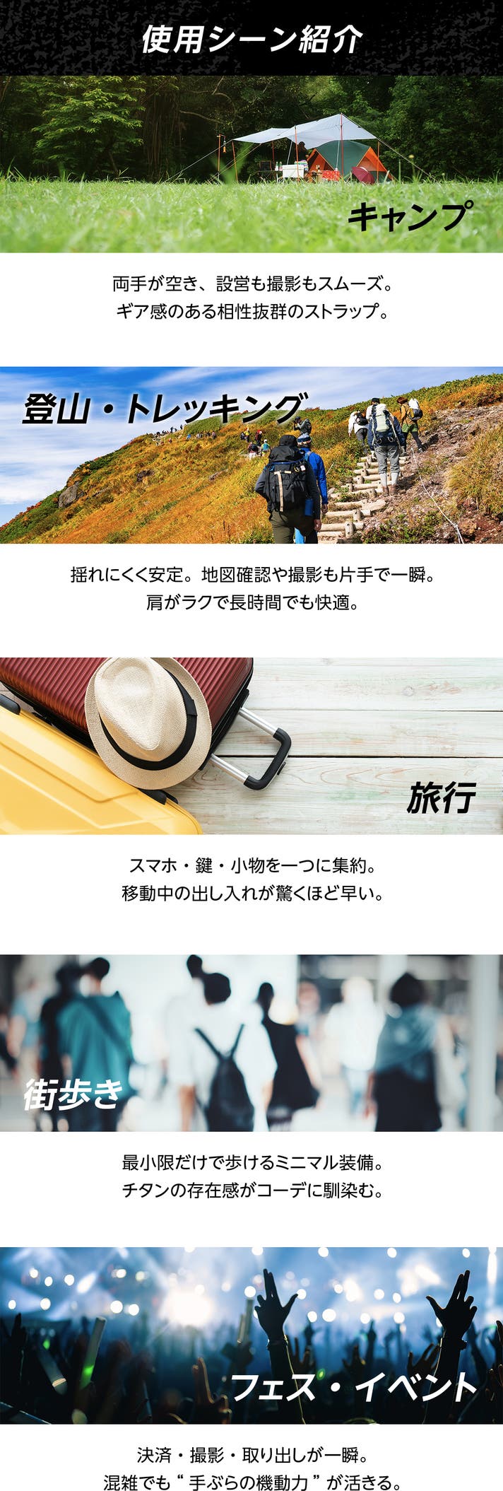 街歩き、キャンプ、旅行、フェスなど、どんな場面でも“ちょうどいい持ち方”が選べるます。
