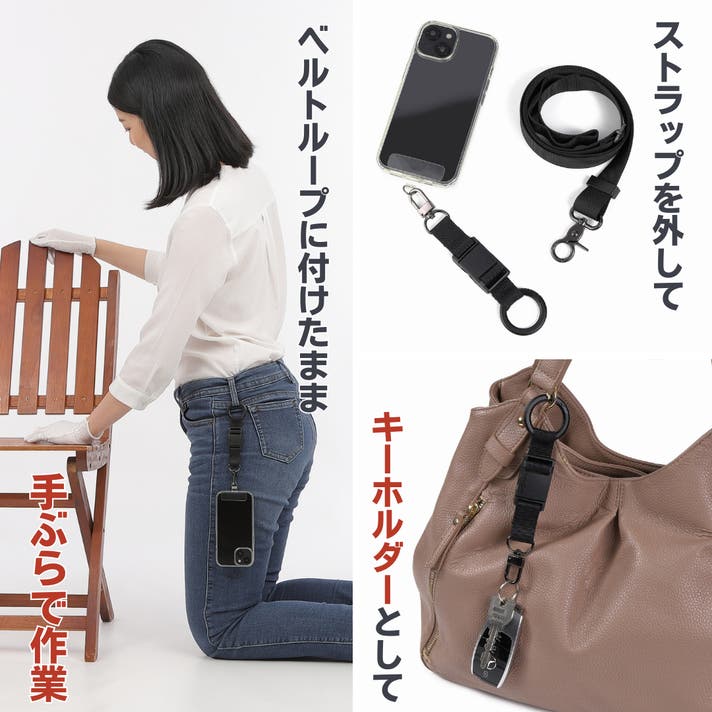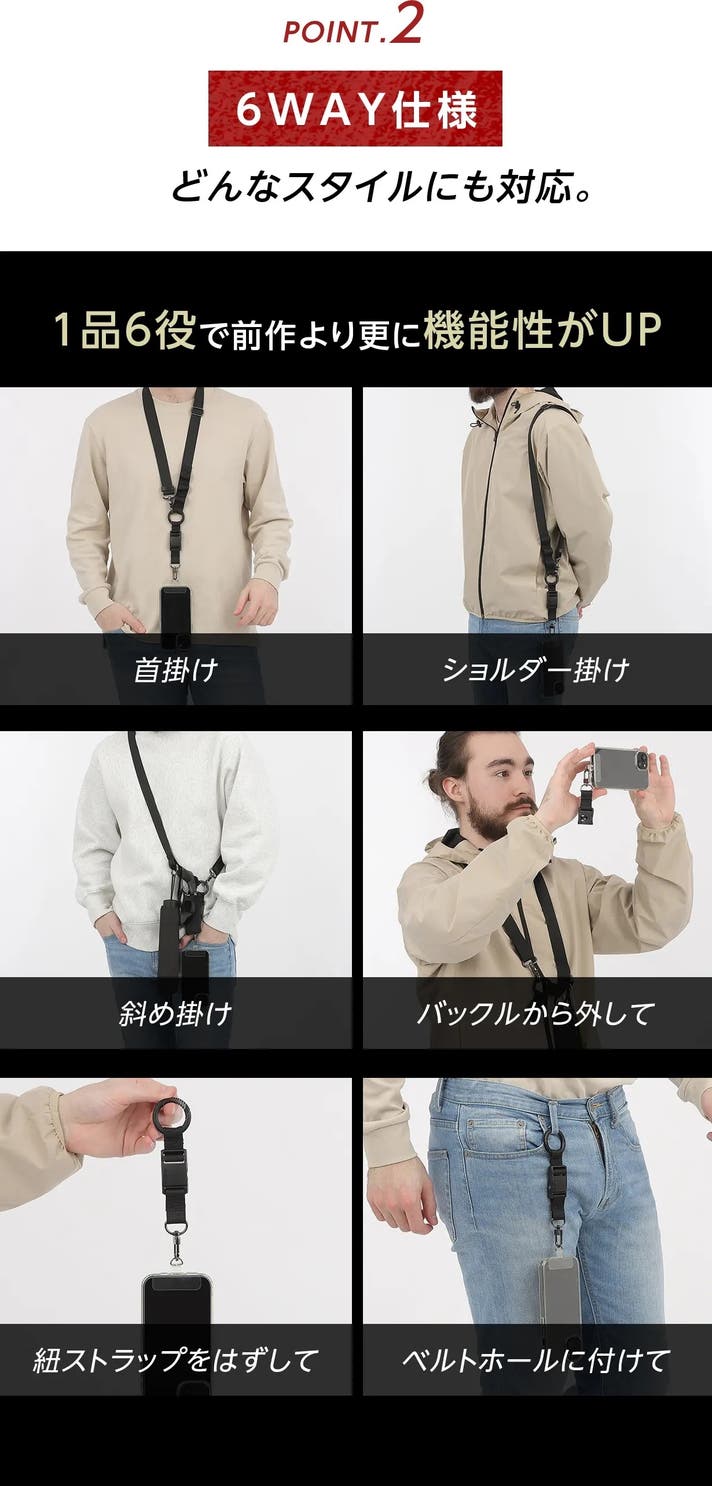 『楽々スマホストラップ3』は、シーンに合わせて 6通りの使い方 ができるマルチ仕様です。