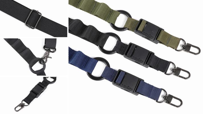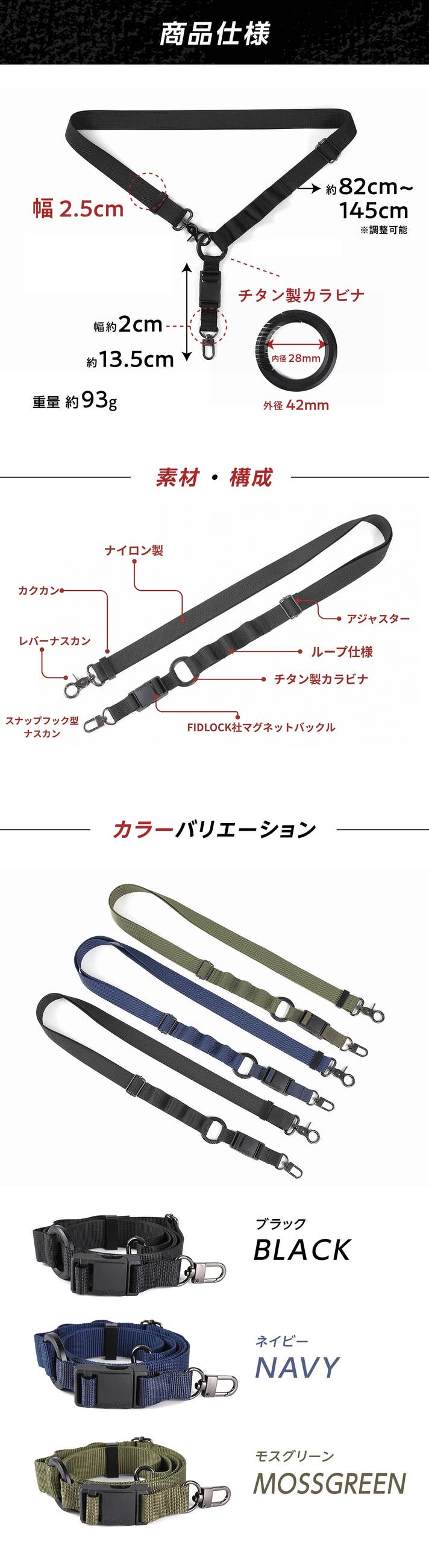 チタンカラビナ、マグネットバックル、幅広25mmテープ、ループ構造という