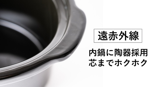 本体と内鍋の2層構造となっており、内鍋に陶器を採用しています。陶器から放射される遠赤外線により、さつま芋の表面だけでなく中身からしっかりと熱が加わり、芯までホクホクした仕上がりになります。