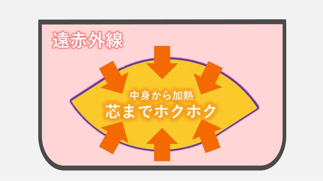 遠赤外線は内部に浸透し、必要以上に水分を蒸発させず、表面と中身を同時に加熱できます。これにより、芯までホクホクした美味しい石焼き芋が出来上がります。