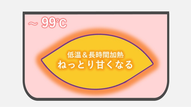 約5時間、約99℃までの低温調理で、余分な加熱をせずにじっくり加熱調理することで、ねっとりとした甘い焼き芋に仕上がりになります。また火の加減を見守る必要がない為、ほったらかして自動調理ができます。