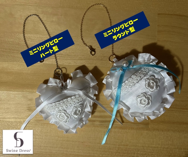 注) ミニリングピローの本体はホワイトのみです。リボンのお色はラウンド型は ブルー、ハート型はホワイトでお作りいたします。