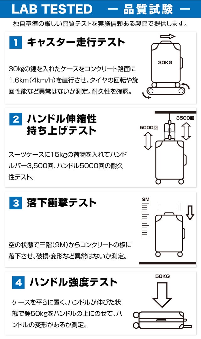 企画設計、シミュレーションしながらの試作を繰り返し、100%品質の素材を厳選し、製品品質を確認した上で生産。落下衝撃テスト・ハンドル