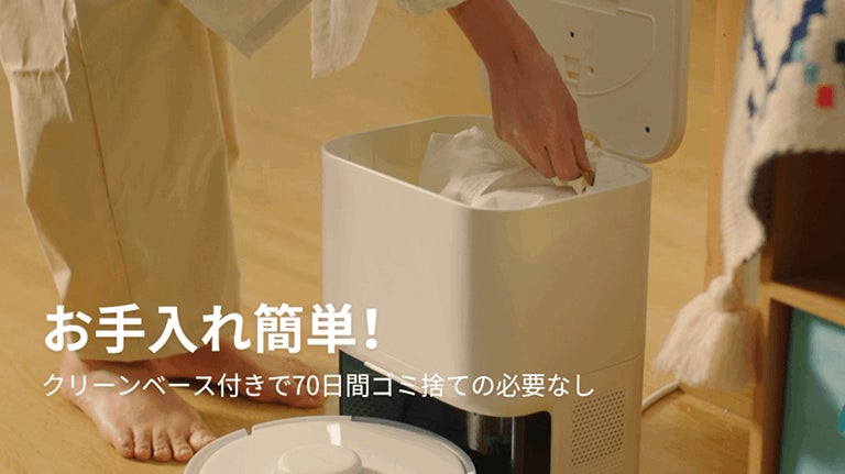遠く離れて暮らすご両親、「機械が苦手……」という方にこそおすすめです。ボタンを押すだけですぐ起動。複雑な事前設定は必要ありません。さらに、ゴミ収集ステーションの搭載や使い捨てお掃除シート対応で、後片付けの手間も一切なし。